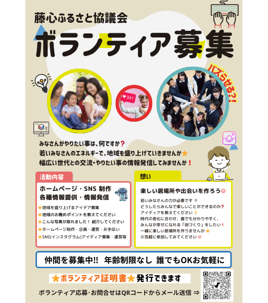 藤心ふる協では、地域活動を一緒に盛り上げるメンバーを募集中です! 詳細は、下のポスターをクリック👆してネ! 最新のお知らせ・投稿は、(↓新着 )ボタンから確認できます。