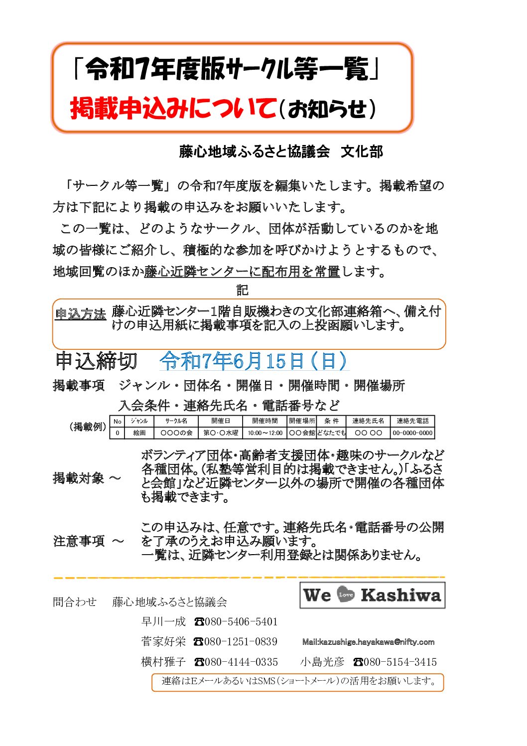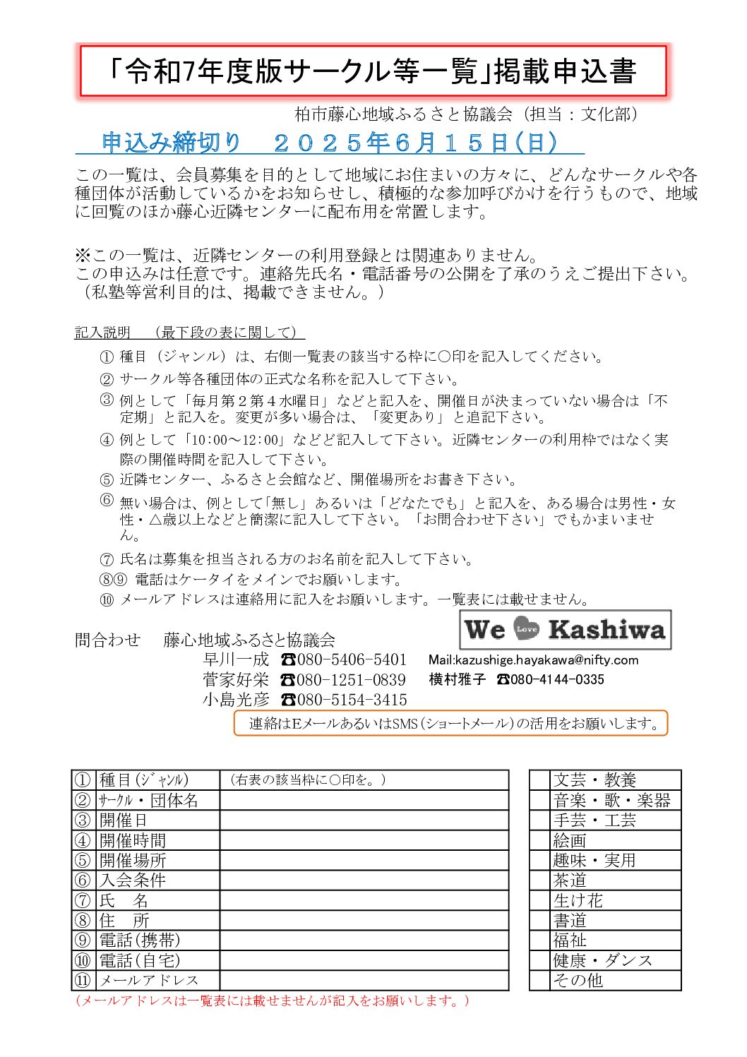 「令和7年度サークル一覧」掲載の募集を始めました、掲載ご希望のサークル団体、代表者の方は藤心近隣センターに設置されている応募用紙に必要事項掲載の上、応募箱に投函、もしくは私のメールアドレスに添付され応募ください、募集期間は令和7年6月15日(日)となっております。
