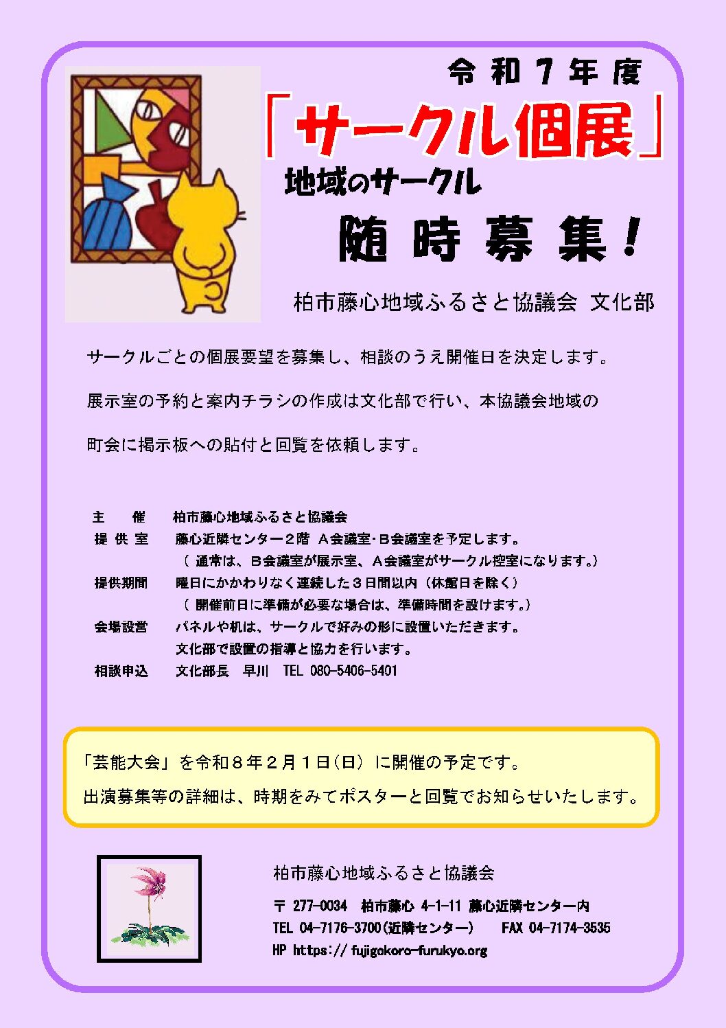 令和7年度サークル個展募集開始のお知らせ 2025-05-05 最終更新日時 : 2025-10-06 藤心ふる協 文化部長 早川一成藤心ふる協 文化部長 早川一成メール「令和7年度サークル個展募集」を開始しました、サークル団体で個展を開きたい方は、メールアドレスにて申込ご連絡お願い致します。